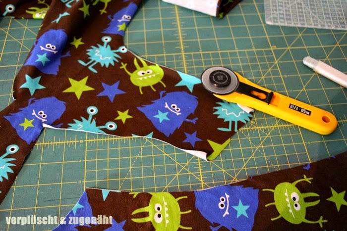Beim Zuschnitt bleiben ja oft kleine Stoffreste, die noch ein bis zwei Monster oder Sterne als Motiv haben. Mit ein wenig Vlisofix, kann man somit auch die kleinsten Reste verwenden.