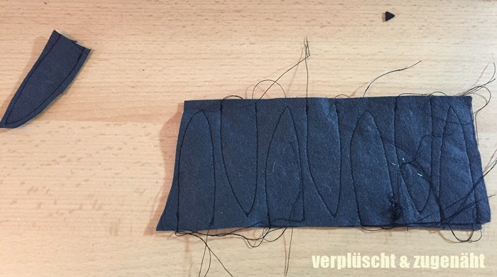 Dann habe ich beim Schliessen der Handfläche noch ein Stück Fleece doppelt gefaltet und unter das Nähgut genäht. Somit stabilisiert sich die Drachenpranke und einen lustigen Effekt konnte ich dadurch noch einbauen.